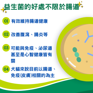 益生菌的研究從最初代發現與腸道健康(改善腹瀉、腸躁症、腸炎等)有關,後續更發現與免疫、泌尿道或腎臟、甚至是心智健康皆有關!彷彿腸道菌相好,一切都會好起來!可惜的是目前這些促進健康研究僅局限於老鼠或是人,針對犬貓健康相關的以腸道、免疫(皮膚)相關的為主!【1】
