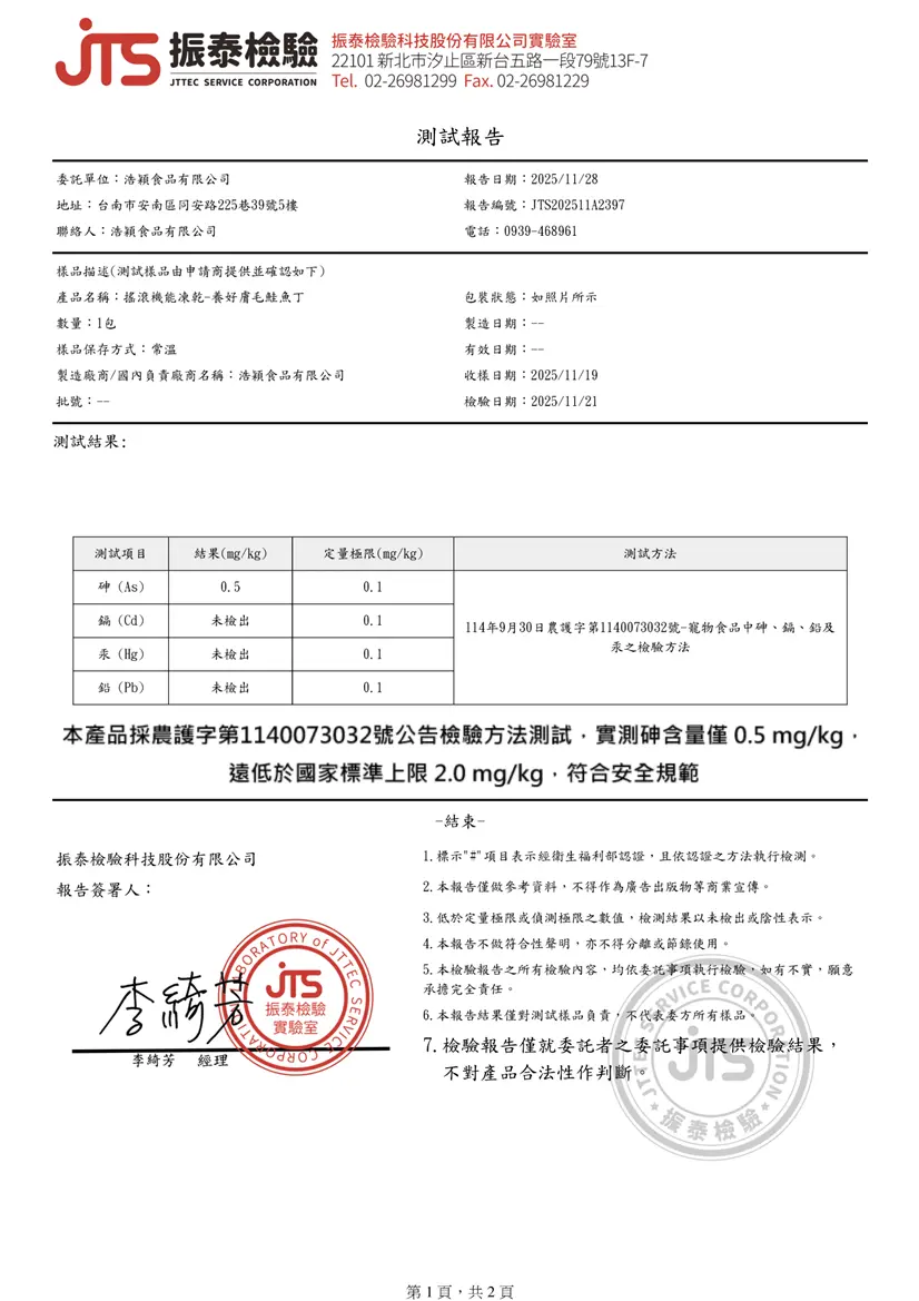 - 人用食品級原食材製作生產,高適口性與極低含水率