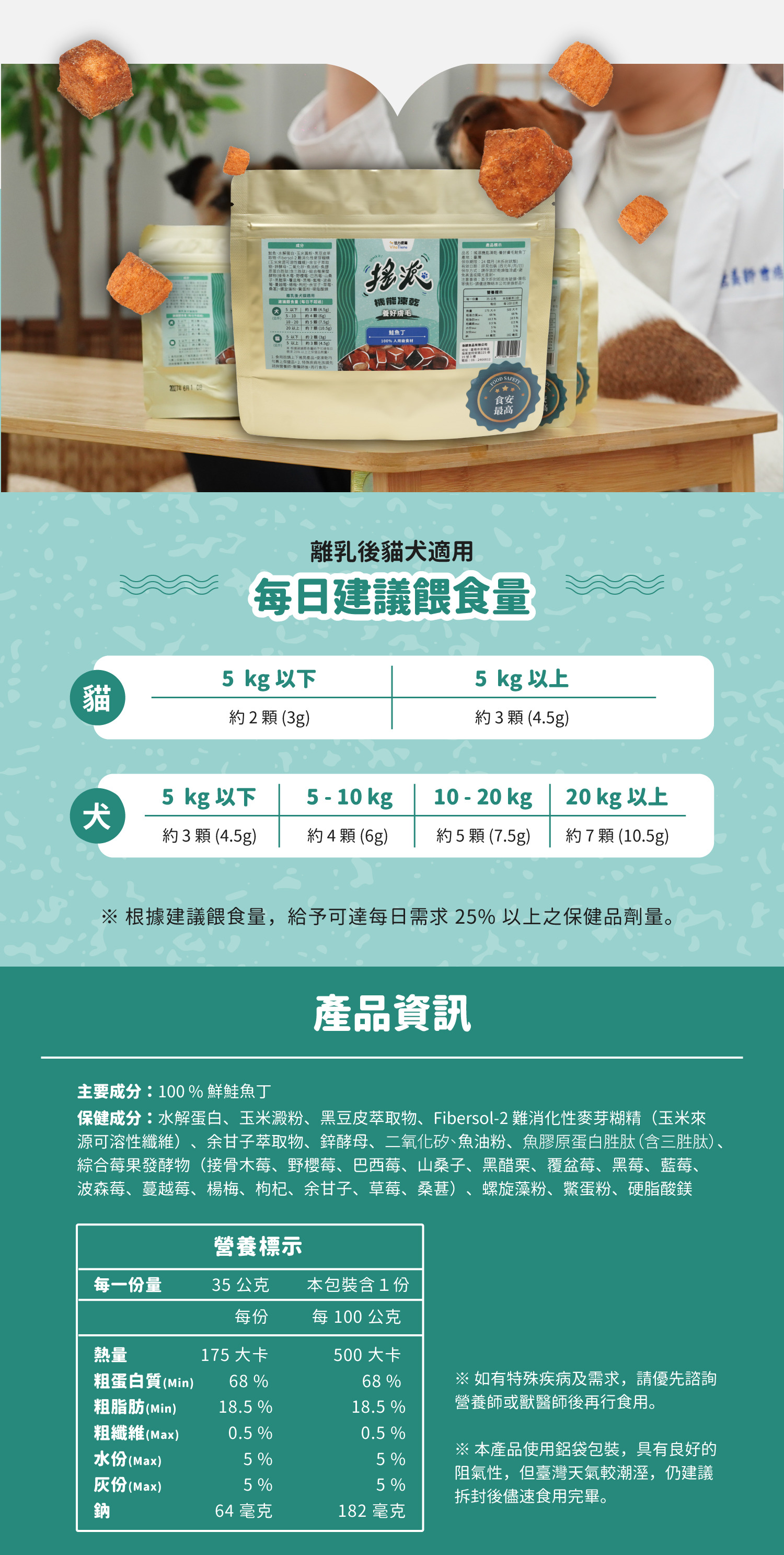 ★ 根據建議餵食量,給予可達每日需求25%以上之保健品劑量。
