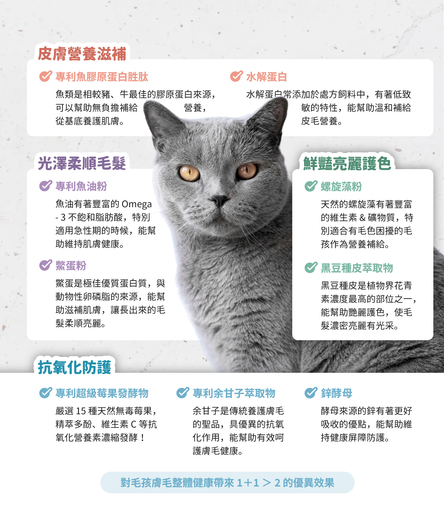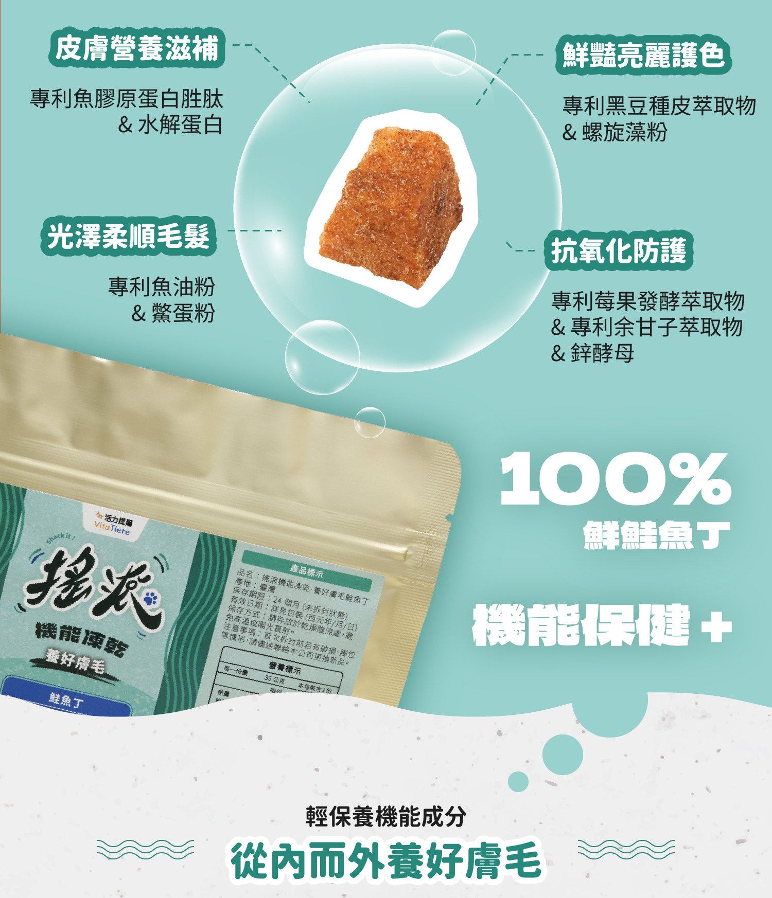 鮭魚鮮香濃郁,深受許多挑嘴犬貓喜愛。本身含有豐富的Omega-3不飽和脂肪酸,更是天然護膚亮毛的優質食材。搭配多種頂級營養品––膠原蛋白胜肽、水解蛋白、魚油等,由內而外支持毛孩肌膚與毛髮健康。
