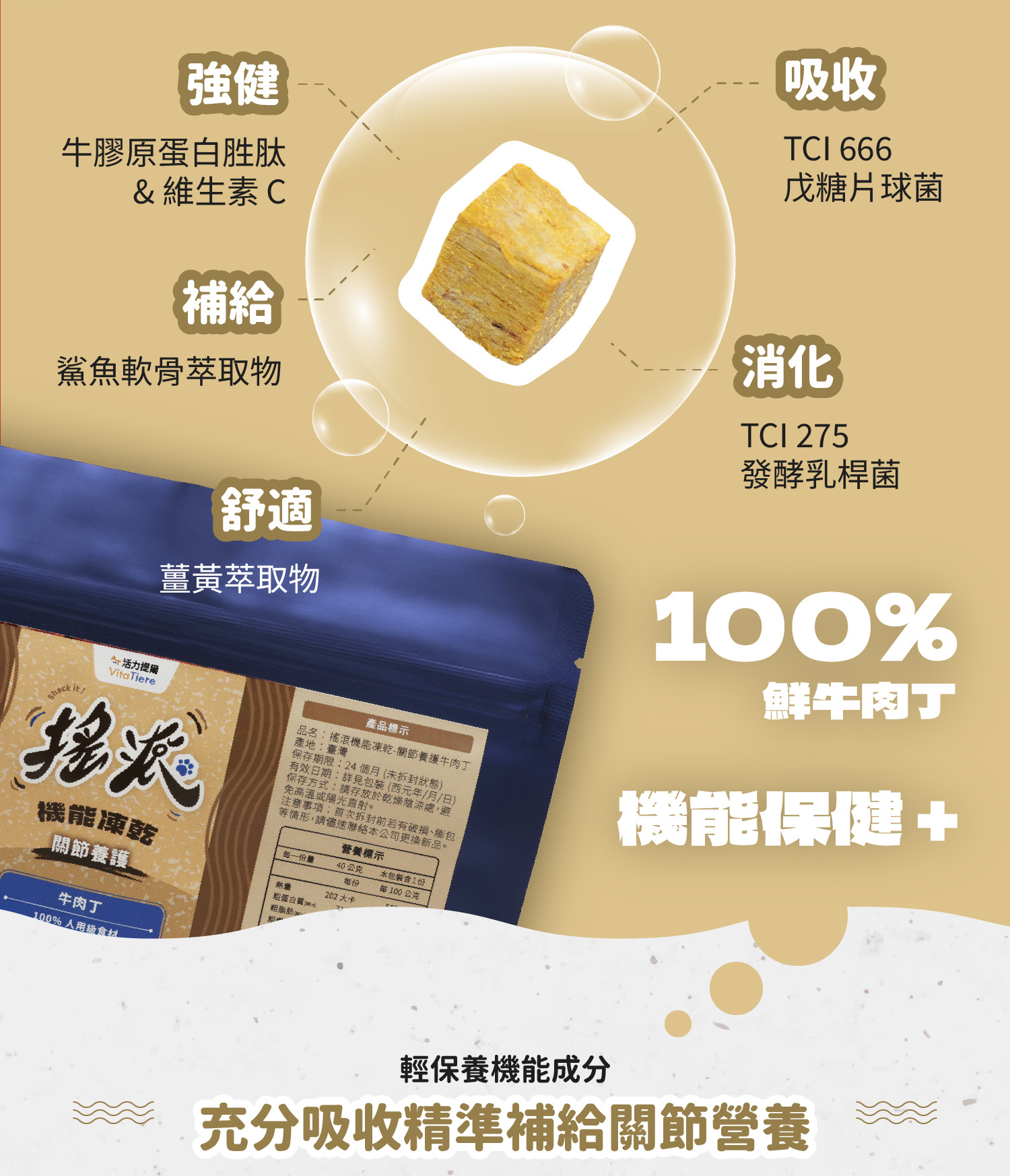 牛肉是很好的優質蛋白質來源,能幫助補給肌肉與關節基底營養,搭配關節養護╳好消化特調配方,讓機能保健品能充分被身體消化吸收,維持毛孩行動力,支持關節靈活。