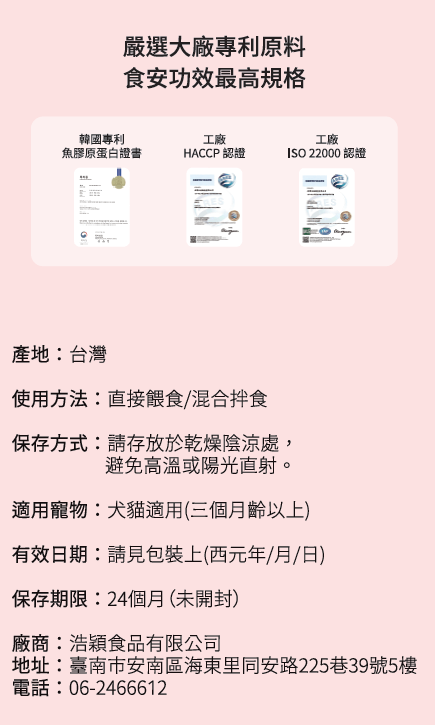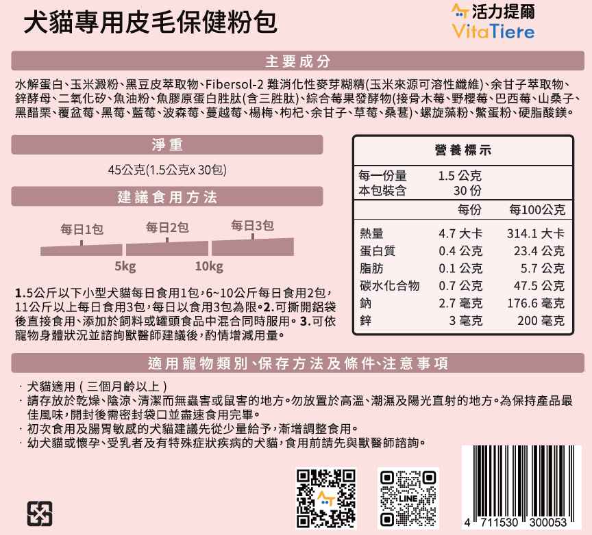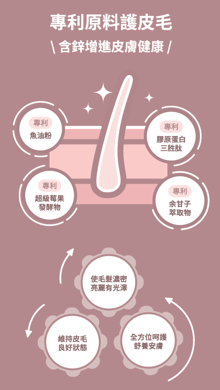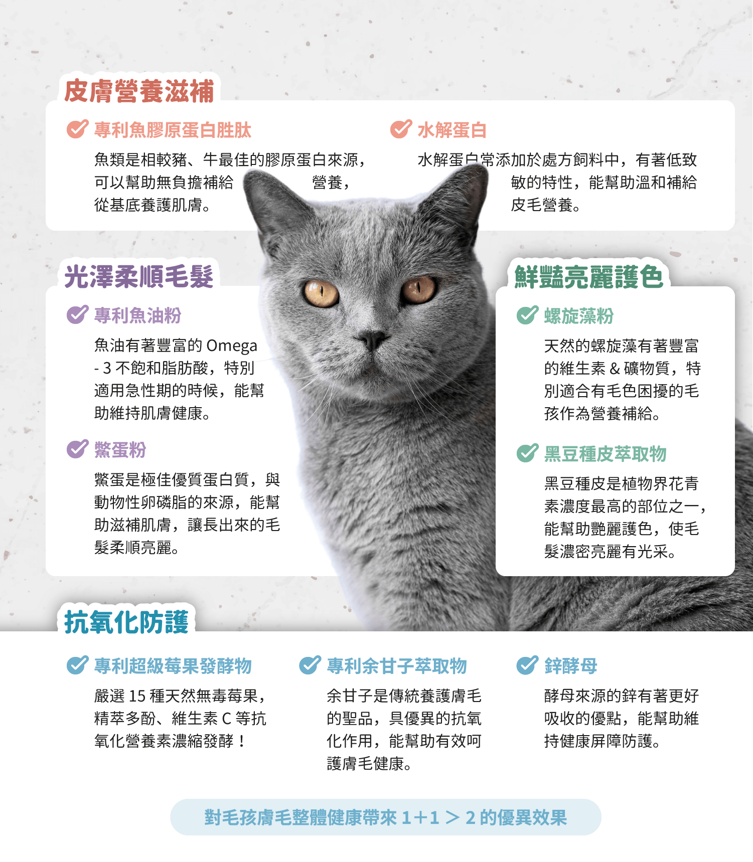 本產品是專為犬貓而設計的寵物皮毛保健品,透過專業團隊的獨家配方設計,使用多種專利原料於毛孩皮毛保養上進行強化,讓您的寵物維持皮毛良好狀態,全方位呵護舒養安膚!